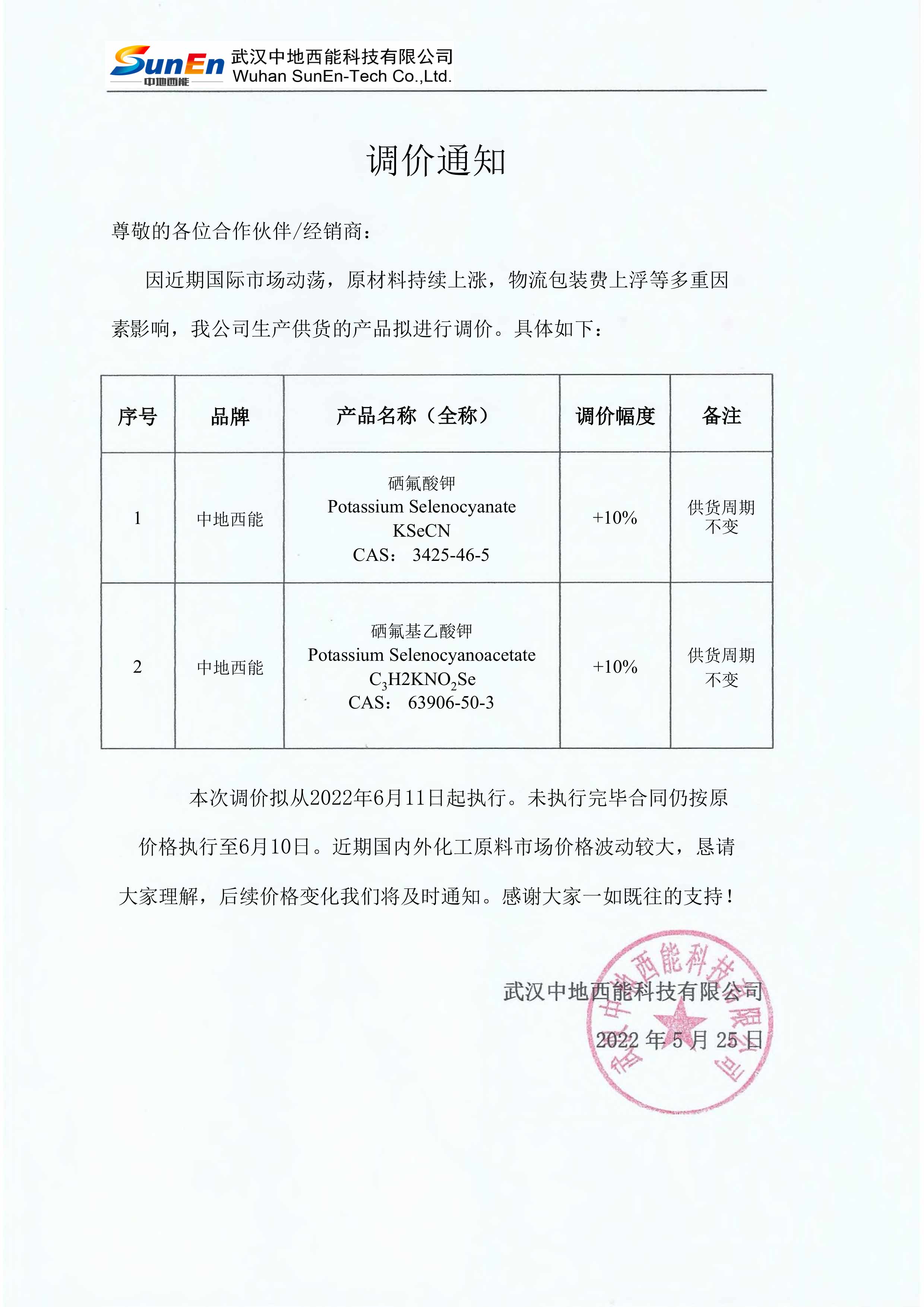 本次調價擬從2022611日起執行。未執行完畢合同仍按原價格執行至610日。近期國內外化工原料市場價格波動較大,懇請大家理解,后續價格變化我們將及時通知。感謝大家一如既往的支持!